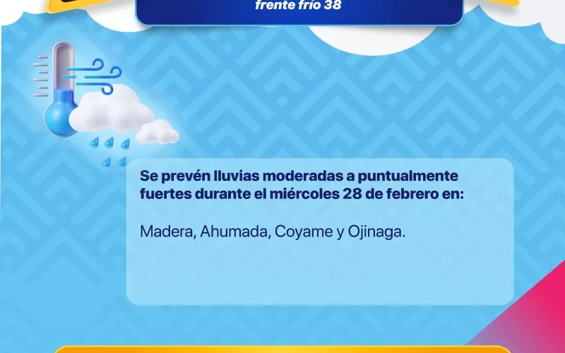 Se anticipan lluvias fuertes a localmente intensas en los municipios de Madera, Ahumada, Coyame y Ojinaga. Para Juárez, Guadalupe, Práxedis G. Guerrero, Ascensión, Janos, Casas Grandes, Nuevo Casas Grandes, Galeana, Ignacio Zaragoza, Gómez Farías, Buenaventura, Namiquipa, Temósachic, Matachí, Guerrero, Bachíniva, Moris, Ocampo, Uruachi, Maguarichi, Cuauhtémoc, Riva Palacio, Chihuahua, Aquiles Serdán, Aldama y Ojinaga, se esperan lluvias dispersas a moderadas con intervalos de chubascos. En el resto del estado, las lluvias serán de ligeras a dispersas.
