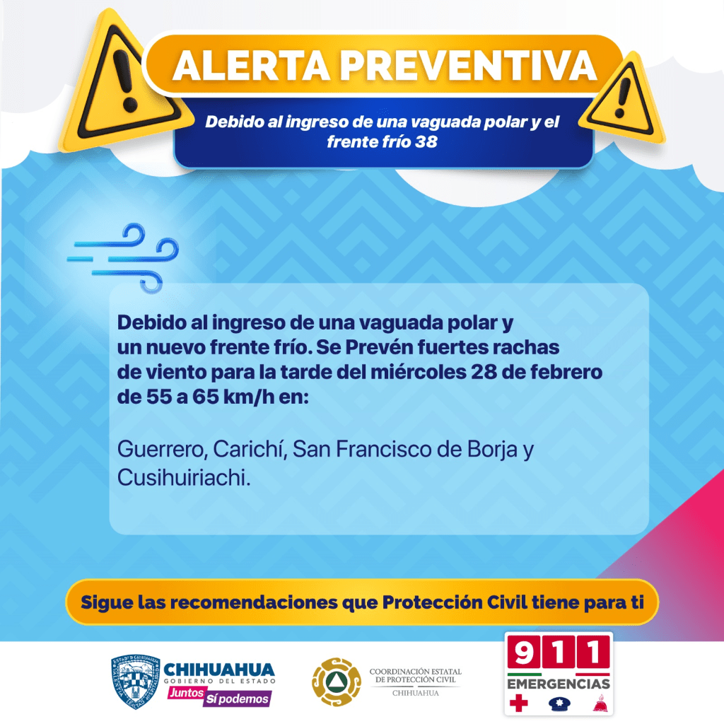 Para el jueves, en Juárez, Guadalupe, Ascensión, Ahumada, Casas Grandes, Ignacio Zaragoza, Madera, Gómez Farías, Ocampo, Temósachic, Chihuahua, Santa Isabel, Satevó y Jiménez, se prevén ráfagas de viento de hasta 45 km/h.