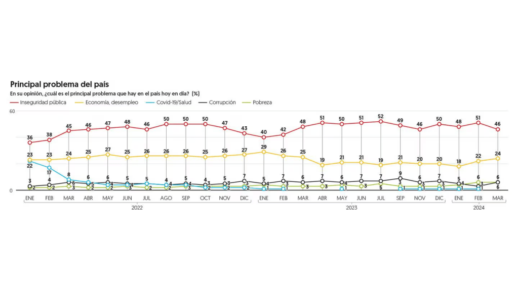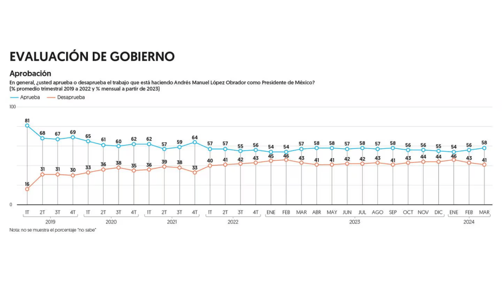 La aprobación al gobierno actual ha sido relativamente constante durante todo el 2023 y hasta el momento del 2024, manteniéndose entre el 54% y el 58%, según los registros de El Financiero. Los datos de marzo muestran que por segundo mes consecutivo, la aprobación al presidente ha experimentado un ligero aumento, superando en cuatro puntos a los registrados a principios de año.