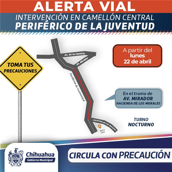 Por otro lado, se informa que a partir del 22 de abril se iniciarán trabajos en el Periférico de la Juventud, desde la avenida Mirador hasta Hacienda Los Morales, con el objetivo de mejorar la seguridad vial mediante la instalación de una barrera central en el camellón.