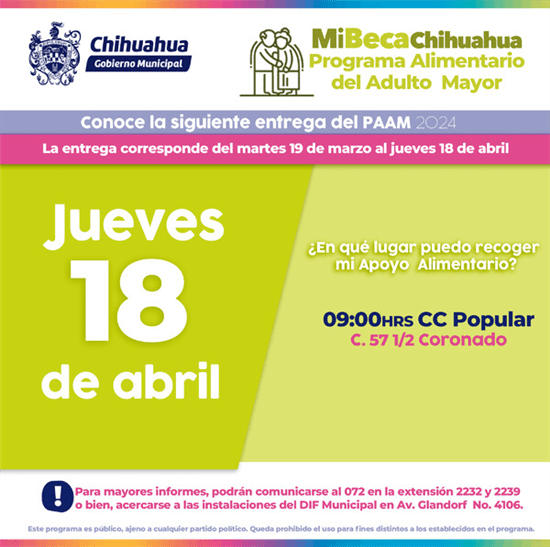 El DIF del Gobierno Municipal desea informar a las personas beneficiarias del Programa Alimentario del Adulto Mayor (PAAM) que podrán recoger sus paquetes de alimentos este jueves 18 de abril en el centro comunitario Popular, a las 9:00 horas.