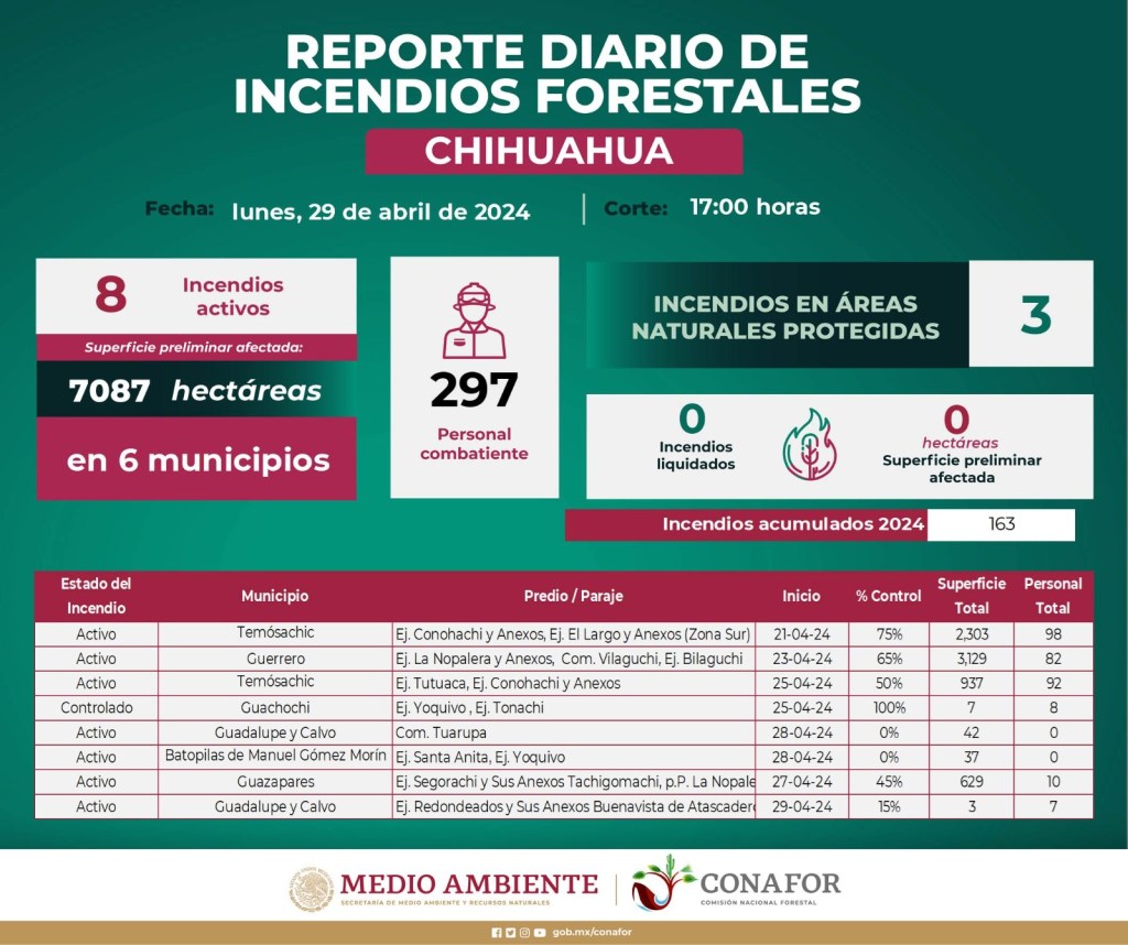 El director de Desarrollo Forestal de la SDR ha informado que cerca de 300 brigadistas están activos en seis municipios del estado, enfrentando los incendios forestales reportados por la Comisión Nacional Forestal (Conafor).