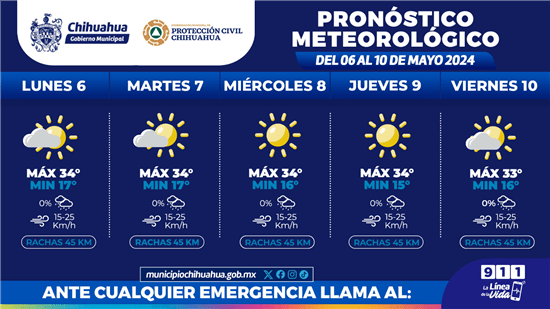 La Coordinación de Protección Civil Municipal ha emitido una alerta ante la llegada de vientos con ráfagas de hasta 45 kilómetros por hora en la ciudad durante esta semana. Además, se prevé que las temperaturas máximas alcancen los 34°C, según informes del Servicio Meteorológico Nacional de CONAGUA.