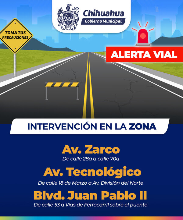 El Gobierno Municipal ha emitido una alerta vial y solicita a los ciudadanos que manejen con precaución en las avenidas Zarco, Tecnológico y boulevard Juan Pablo II debido a trabajos de mantenimiento para mejorar la seguridad vial.