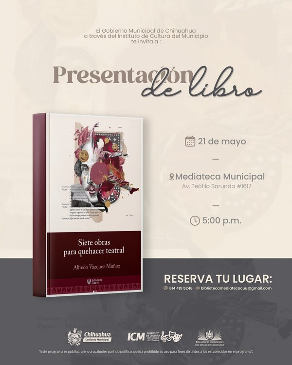 El Gobierno Municipal de Chihuahua, a través del Instituto de Cultura del Municipio, invita a la comunidad a la presentación del libro «Siete obras para quehacer teatral» del autor Alfredo Vázquez Muñoz. Este libro ha sido seleccionado como parte del Programa Editorial Chihuahua (PECH) 2023 y promete cautivar a los lectores con su profundidad y originalidad.