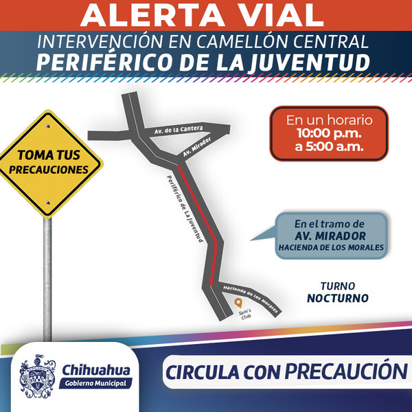 El Gobierno Municipal, a través de la Dirección de Obras Públicas, informa que los trabajos nocturnos en el camellón central del Periférico de La Juventud, desde la avenida Mirador hasta la calle Hacienda de los Morales, continúan en curso.