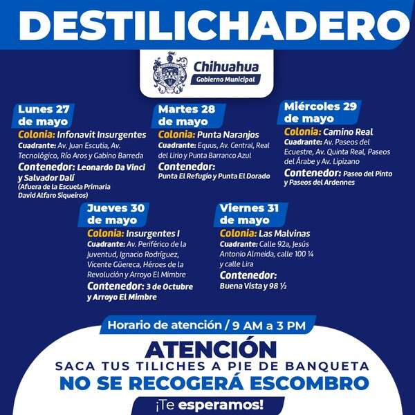 Para evitar la acumulación de basura grande en las viviendas, lo que podría generar plagas o problemas de salud, el Gobierno Municipal ha lanzado el programa Destilichadero, que se llevará a cabo del 27 al 31 de mayo en cinco colonias de la capital.