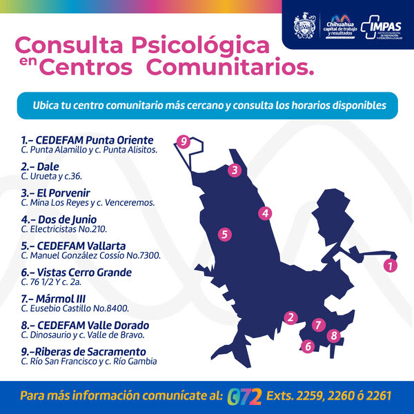 Para mejorar el bienestar emocional de las familias chihuahuenses y facilitar el acceso a servicios de salud mental, el Gobierno Municipal de Chihuahua, a través del Instituto Municipal de Prevención y Atención a la Salud (IMPAS), ha puesto a disposición consultas psicológicas gratuitas en varios puntos de la ciudad.