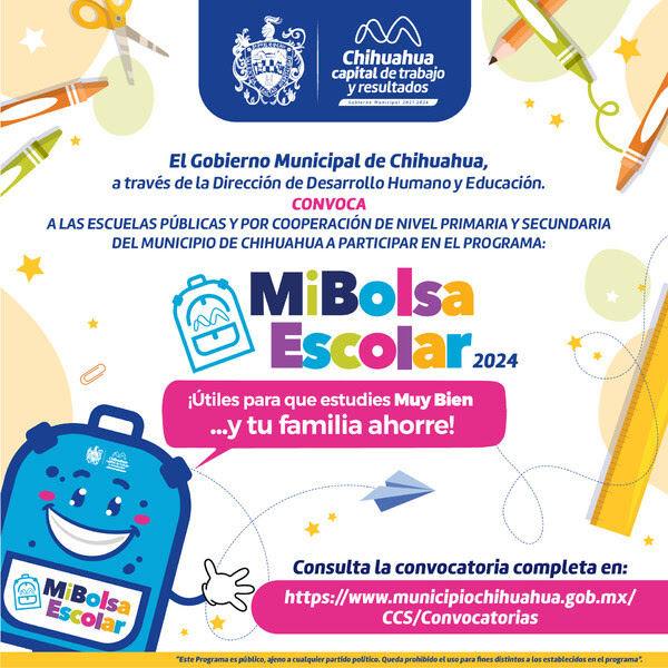 El Gobierno Municipal de Chihuahua ha lanzado la convocatoria para el programa «Mi Bolsa Escolar Chihuahua», dirigido a escuelas primarias y secundarias públicas y de cooperación. Este programa tiene como objetivo principal proporcionar útiles escolares y mochilas a las instituciones educativas seleccionadas.