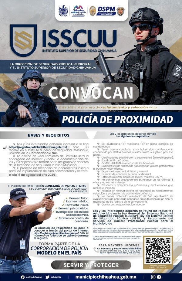 Por su parte, Martha Moctezuma informó que la convocatoria estará abierta hasta el 16 de agosto de este año. Además, recomendó a los aspirantes conservar el folio que se genera al registrarse en la plataforma, ya que con este podrán seguir el progreso de su proceso de ingreso a través de la página registro.policiachihuahua.gob.mx.