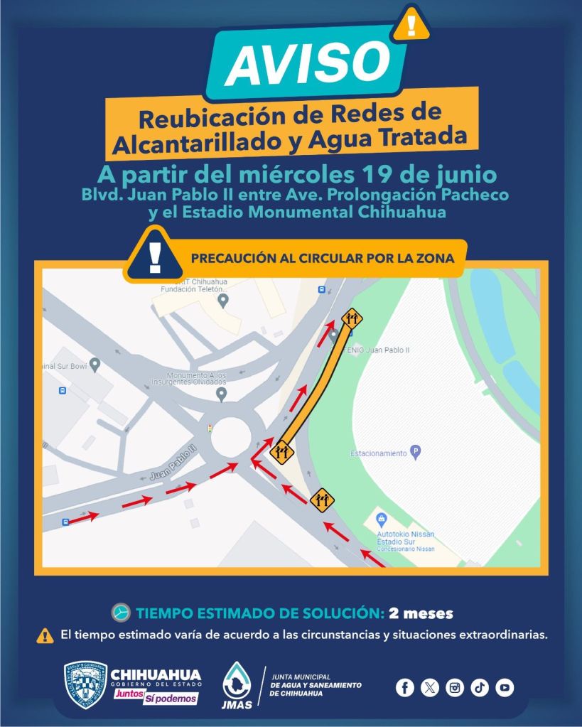 La Junta Municipal de Agua y Saneamiento (JMAS) de Chihuahua ha anunciado que iniciará la reubicación de las redes de alcantarillado y agua tratada a partir de este miércoles 19 de junio. Los trabajos se llevarán a cabo sobre el bulevar Juan Pablo II, entre la avenida Carlos Pacheco y el Estadio Monumental.