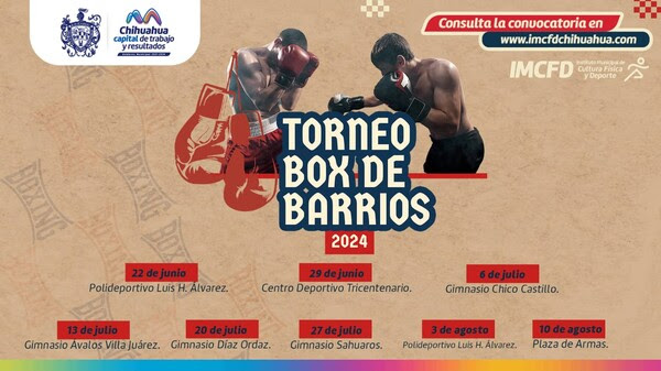 Este sábado 22 de junio comenzará el esperado Torneo «Box de Barrios» en Chihuahua, organizado por el Gobierno Municipal en colaboración con el Instituto Municipal de Cultura Física y Deporte y el Comité Municipal de Boxeo. El torneo se desarrollará durante ocho sábados consecutivos.