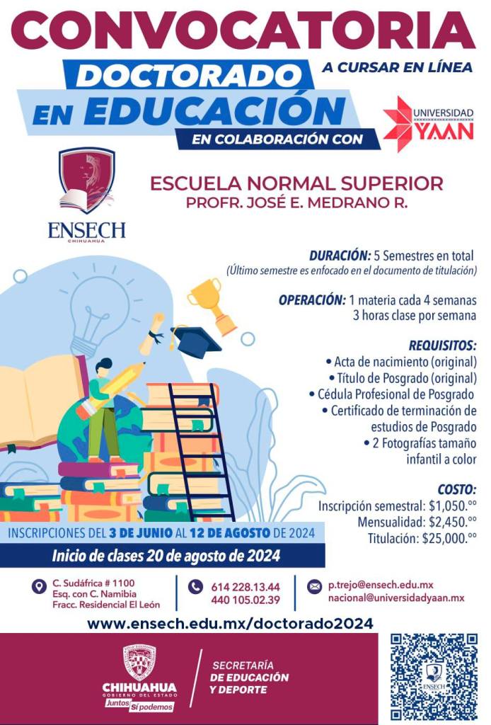 La Escuela Normal Superior del Estado de Chihuahua “Profr. José E. Medrano R.” (Ensech) ha abierto la convocatoria para su Doctorado en Educación, que se ofrece en modalidad en línea. Este programa es parte de las múltiples opciones de profesionalización continua que la institución ofrece, en colaboración con la Universidad YAAN.