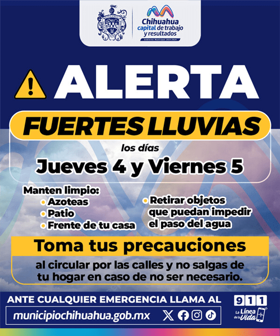 El Gobierno Municipal de Chihuahua, a través de la Coordinación Municipal de Protección Civil, ha emitido un aviso preventivo ante la previsión de lluvias y chubascos dispersos para los días 4 y 5 de julio. Este pronóstico ha sido proporcionado por el Servicio Meteorológico Nacional de CONAGUA.