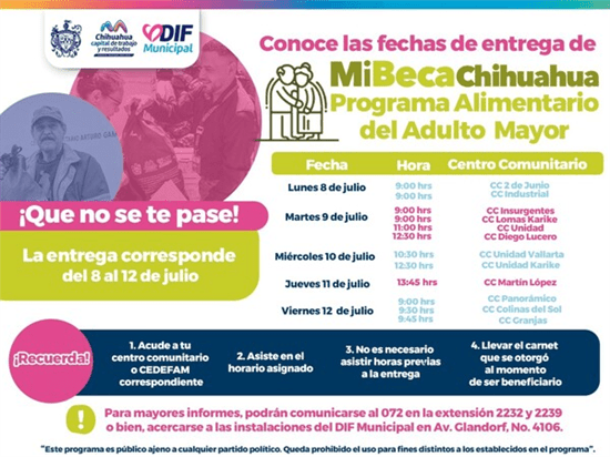 El DIF Municipal anunció las fechas y centros comunitarios donde los beneficiarios del Programa Alimentario del Adulto Mayor (PAAM) podrán recoger su apoyo del 8 al 12 de julio.