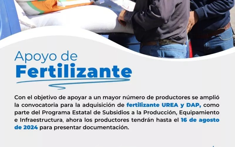 La Secretaría de Desarrollo Rural (SDR) ha anunciado que se amplió el plazo para participar en el Programa Estatal de Subsidios a la Producción, Equipamiento e Infraestructura (PESPEI), el cual ofrece apoyo económico para la compra de fertilizantes. La nueva fecha límite para registrarse es el 16 de agosto de 2024.
