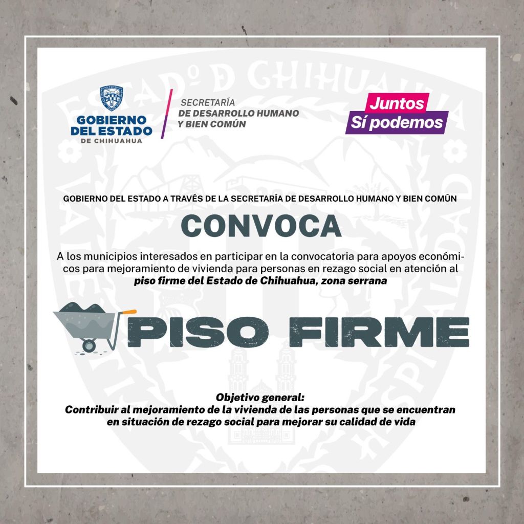 La Secretaría de Desarrollo Humano y Bien Común (SDHyBC) ha lanzado la convocatoria «Piso Firme» dirigida a las autoridades de los municipios de la Sierra Tarahumara. Este programa ofrece apoyos económicos para el mejoramiento de viviendas, con el objetivo de ayudar a las personas en situación precaria, reducir la desigualdad y mejorar la calidad de vida de los más vulnerables.