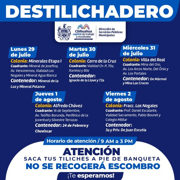 - Jueves 1 de agosto: Alfredo Chávez (Contenedor en 24 de Febrero y Chuvíscar)
