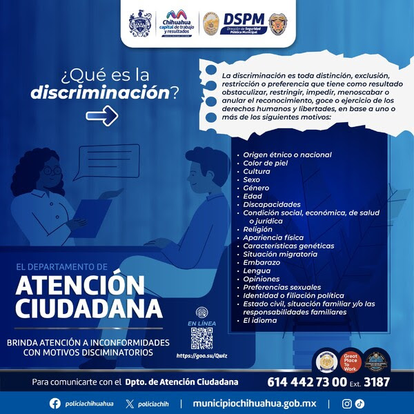 La Dirección de Seguridad Pública Municipal (DSPM) ha habilitado un sistema para recibir quejas de personas que sientan haber sido víctimas de discriminación durante intervenciones de policías, bomberos o al recibir atención administrativa. Los afectados pueden presentar sus denuncias en las oficinas del Departamento de Atención Ciudadana, ubicadas en las comandancias Norte y Sur. También tienen la opción de llamar al 614-442-73-00, extensión 3187, para recibir más información y asistencia.