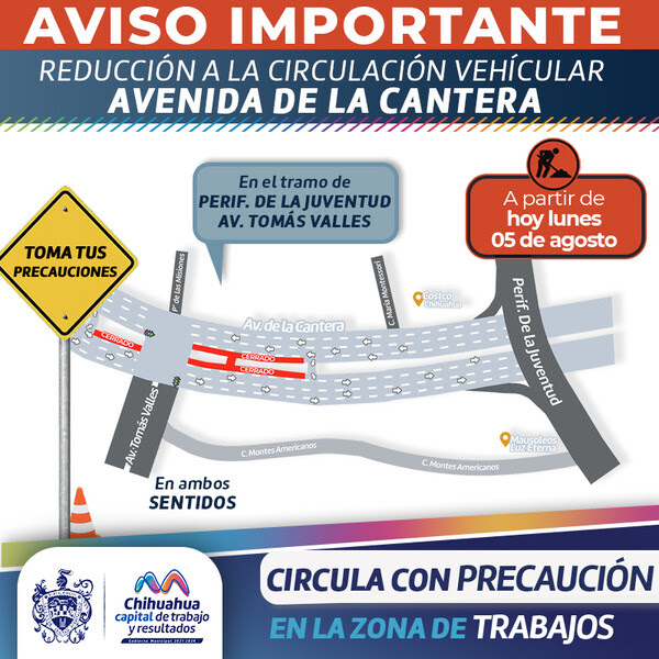 A partir de hoy, la circulación vehicular en la avenida De La Cantera se verá reducida debido a trabajos de adecuación vial. La Dirección de Obras Públicas del Gobierno Municipal informó que los carriles junto al camellón central, en el tramo entre Periférico de la Juventud y avenida Tomás Valles, estarán cerrados.
