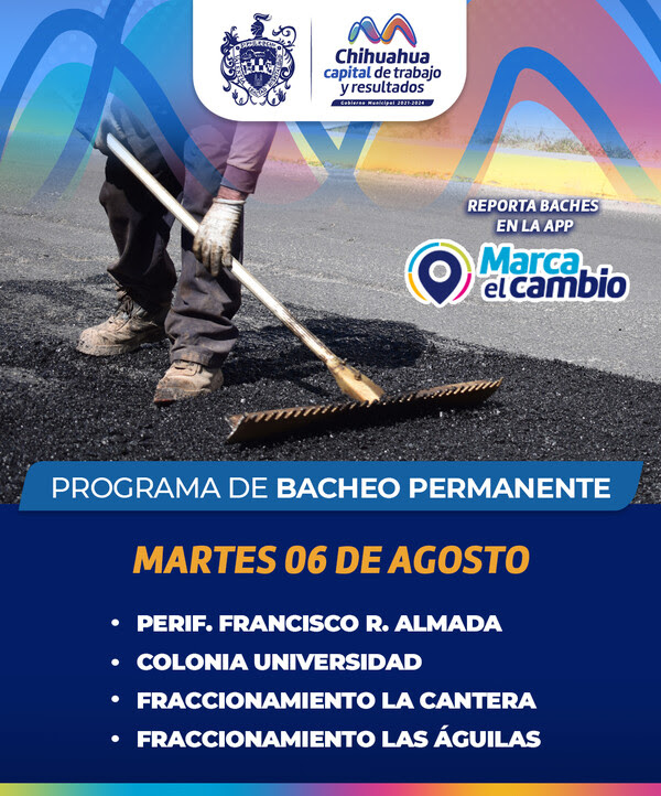 Hoy, martes 6 de agosto, el Gobierno Municipal llevará a cabo trabajos de bacheo en varias áreas de la capital para mejorar las calles y avenidas. Los trabajos se realizarán en el periférico Francisco R. Almada, en la colonia Universidad, y en los fraccionamientos La Cantera y Las Águilas.