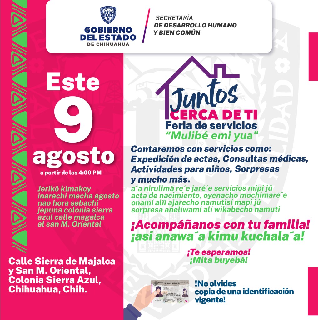 Este viernes 9 de agosto, la feria «Juntos Cerca de Ti» se instalará en la colonia Sierra Azul, en la ciudad de Chihuahua, para ofrecer diversos servicios del Gobierno del Estado a los ciudadanos. La Secretaría de Desarrollo Humano y Bien Común (SDHyBC) anunció que el evento iniciará a las 16:00 horas, en las calles Sierra de Majalca y San M. Oriental.