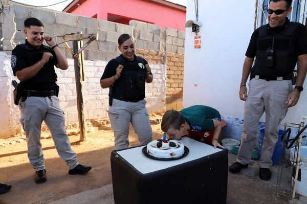 En un gesto de solidaridad y apoyo a la comunidad, policías municipales de la colonia Vistas Cerro Grande sorprendieron a Jahir Alonso en su cumpleaños número ocho. El pequeño había soñado con tener policías en su fiesta para escuchar las sirenas de las patrullas.