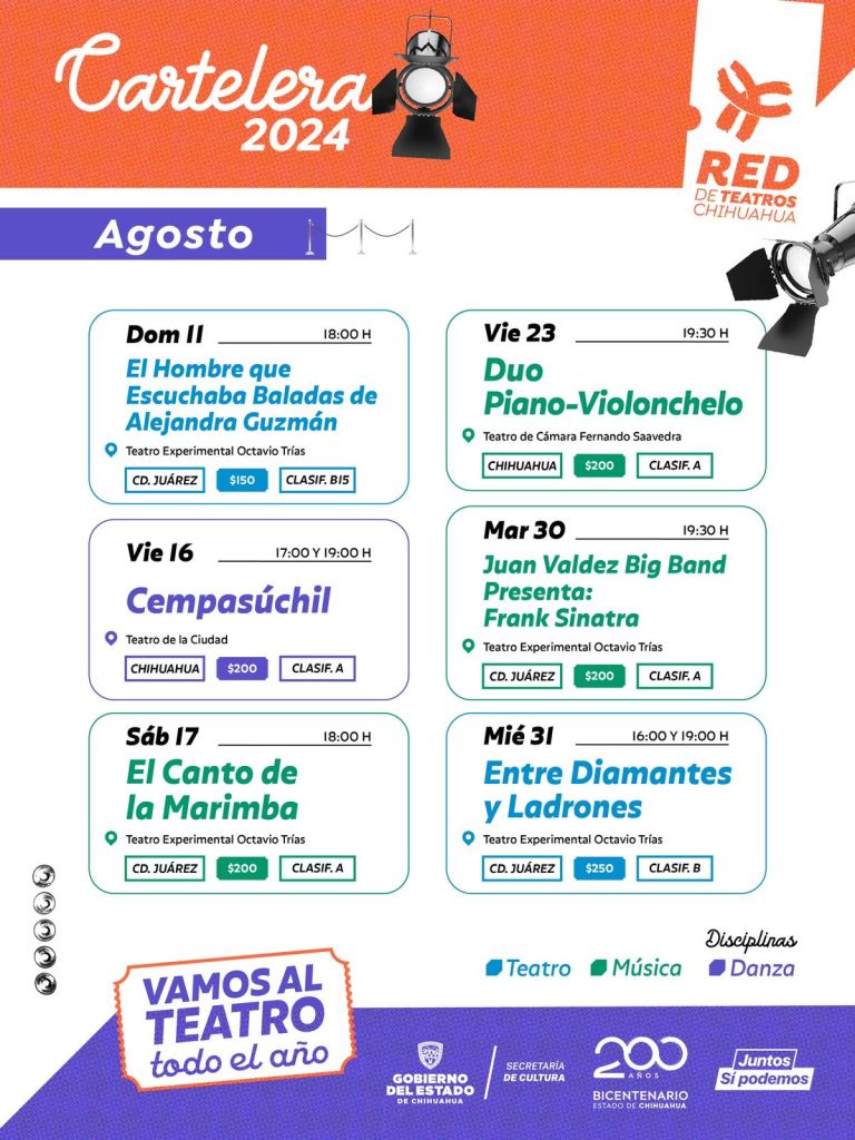 La Secretaría de Cultura de Chihuahua presenta una variada agenda de eventos en agosto. En Ciudad Juárez, destacan: