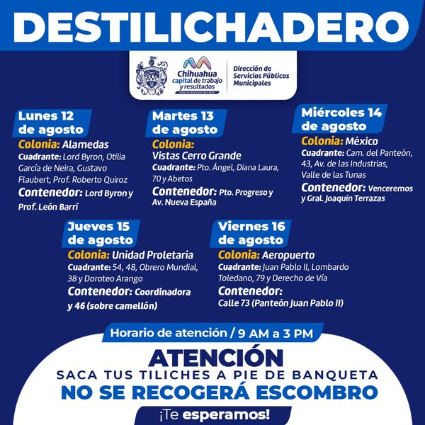 El Gobierno Municipal, a través de la Dirección de Servicios Públicos Municipales, ha anunciado que el programa Destilichadero visitará cinco colonias de la ciudad entre el 12 y el 16 de agosto. Este programa busca evitar la acumulación de basura y prevenir problemas de salud o plagas.
