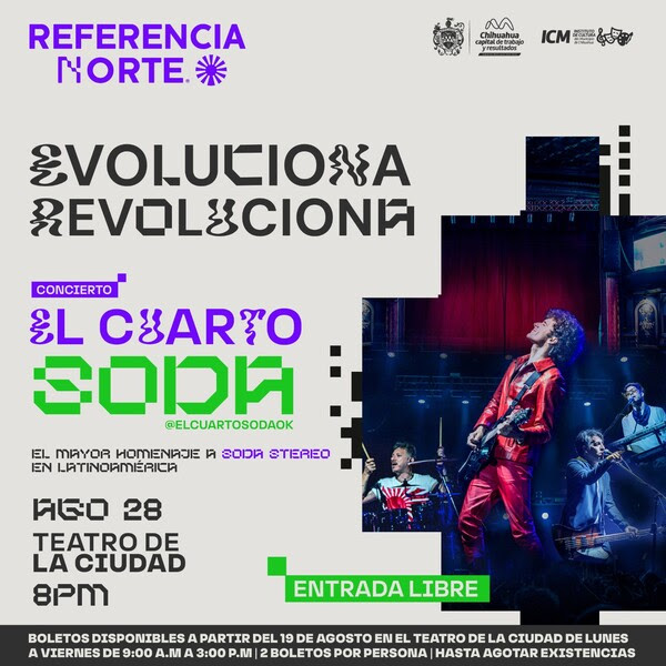El concierto, que forma parte de las actividades de Referencia Norte 2024, se llevará a cabo el 28 de agosto a las 8:00 pm en el Teatro de la Ciudad. El Cuarto Soda, liderado por Brian Tolenti, es una de las bandas de tributo más destacadas en América Latina y ha recorrido varios países rindiendo homenaje a Soda Stereo.