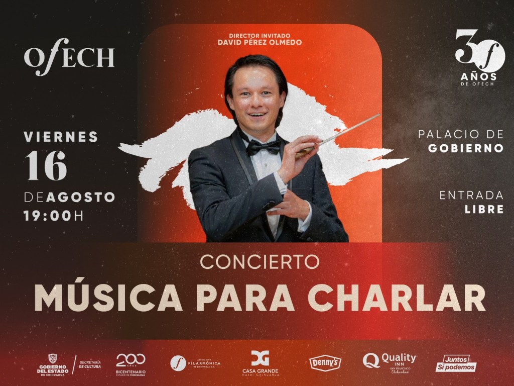 La Secretaría de Cultura invita al primer concierto de la Temporada de Verano 2024 de la Orquesta Filarmónica del Estado de Chihuahua (OFECh). El recital, titulado “Música para Charlar”, será dirigido por el reconocido director poblano David Pérez Olmedo y se llevará a cabo el viernes 16 de agosto a las 19:00 horas en el Patio Central del Palacio de Gobierno. La entrada es libre.