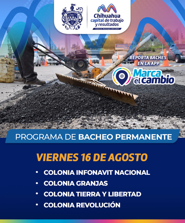 El Gobierno Municipal, a través de la Dirección de Obras Públicas, sigue adelante con el Programa Permanente de bacheo. Hoy, viernes 16 de agosto, se realizarán labores de reparación de calles en las colonias Infonavit Nacional, Granjas, Tierra y Libertad, y Revolución.