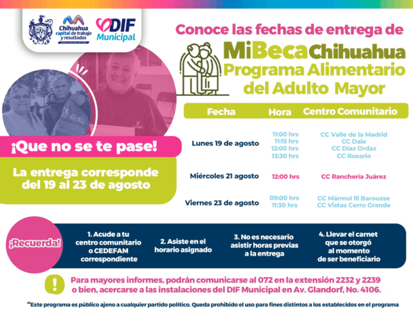 El DIF Municipal ha anunciado los lugares y fechas para recoger los apoyos del Programa Alimentario del Adulto Mayor (PAAM) del 19 al 23 de agosto. Los beneficiarios deben acudir al centro comunitario correspondiente a la hora indicada y presentar el carnet entregado al ser seleccionados.