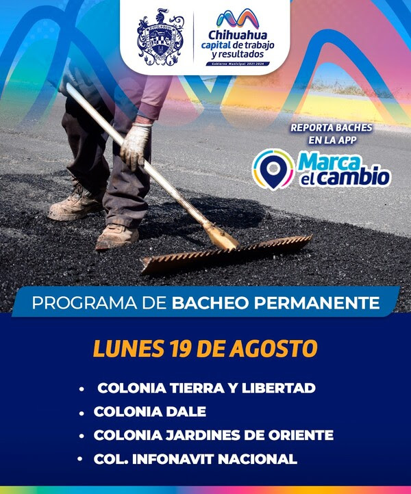 El Gobierno Municipal, a través de la Dirección de Obras Públicas, continúa atendiendo los reportes de la ciudadanía sobre baches. Hoy lunes 19 de agosto, se llevarán a cabo trabajos de bacheo en las colonias Tierra y Libertad, Dale, Jardines de Oriente e Infonavit Nacional.