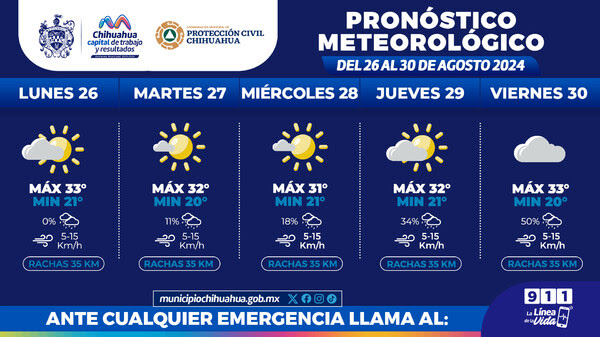 La Coordinación de Protección Civil Municipal informa que esta semana se espera un clima caluroso en la ciudad, con temperaturas máximas de hasta 33°C y mínimas de 20°C. Además, hay posibilidad de lluvias desde el martes hasta el viernes.