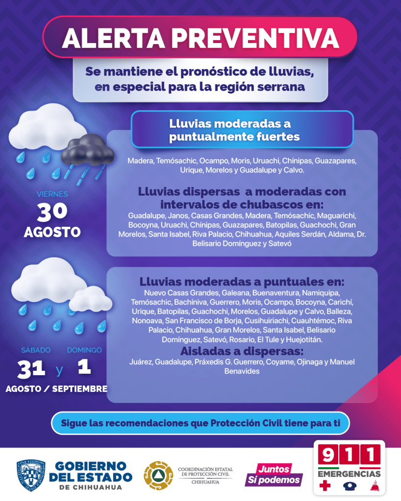 El sábado 31 de agosto y el domingo 1 de septiembre, se espera que las lluvias sean de moderadas a fuertes en Nuevo Casas Grandes, Galeana, Buenaventura, Namiquipa, Temósachic, Bachíniva, Guerrero, Moris, Ocampo, Bocoyna, Carichí, Urique y Batopilas. Las mismas condiciones se presentarán en Guachochi, Morelos, Guadalupe y Calvo, Balleza, Nonoava, San Francisco de Borja, Cusihuiriachi, Cuauhtémoc, Riva Palacio, Chihuahua, Gran Morelos, Santa Isabel, Belisario Domínguez, Satevó, Rosario, El Tule y Huejotitán. En Juárez, Guadalupe, Práxedis G. Guerrero, Coyame, Ojinaga y Manuel Benavides, se esperan lluvias aisladas a dispersas.