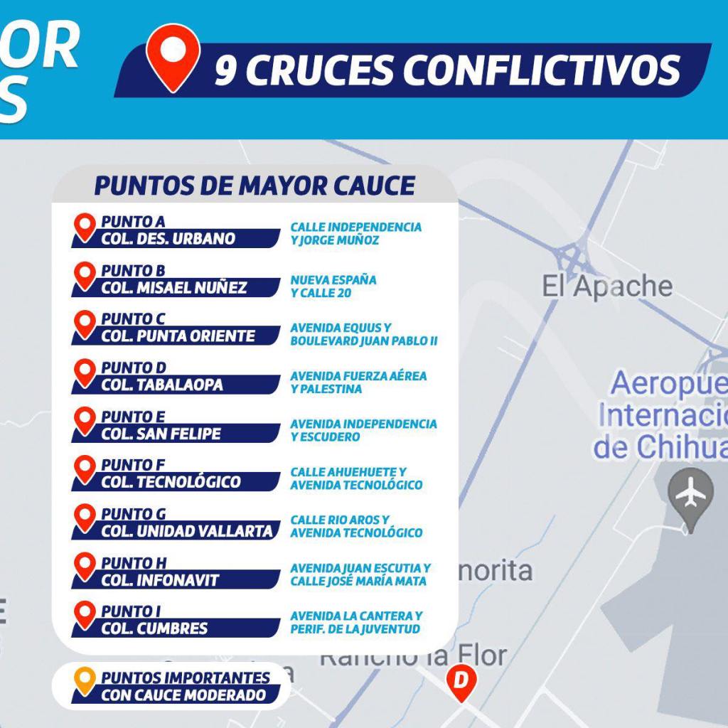 Las autoridades de Chihuahua Capital han emitido una alerta debido a las lluvias que afectan la ciudad. Se ha identificado un total de 9 cruces conflictivos y puntos donde la corriente de agua es más fuerte, lo que representa un peligro para los conductores y peatones.