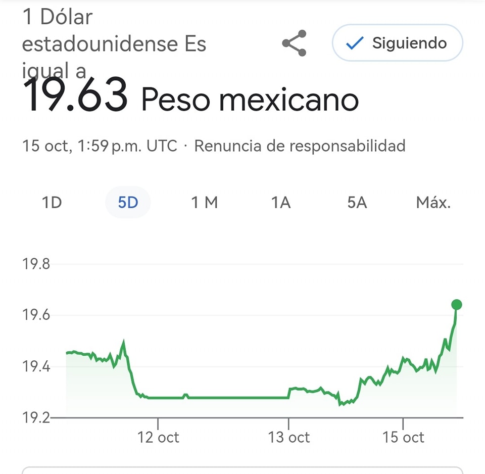 Este martes, el peso mexicano se depreció un 1.21% frente al dólar, cerrando en 19.61 unidades, lo que representa un aumento de 22 centavos en comparación con el cierre del lunes. Esta caída se debe principalmente a la expectativa de que la Reserva Federal de Estados Unidos hará recortes menores en su tasa de interés y al aumento en la aversión al riesgo, según datos de Bloomberg.