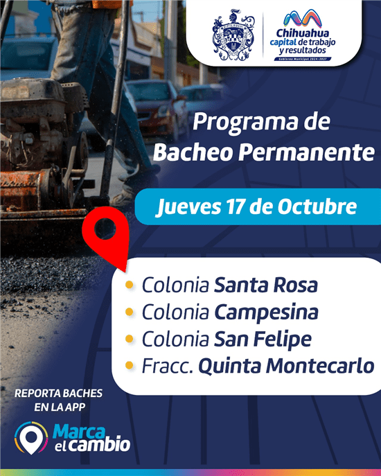 El Gobierno Municipal de Chihuahua llevará a cabo trabajos de bacheo este 17 de octubre en las colonias Santa Rosa, Campesina, San Felipe y el fraccionamiento Montecarlo. Estas labores forman parte de los esfuerzos por mejorar las vialidades de la ciudad.