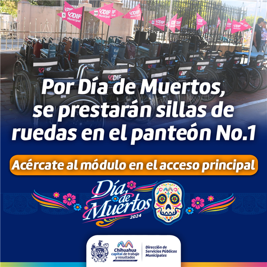 El Municipio, a través de la Dirección de Servicios Públicos Municipales, ofrecerá sillas de ruedas en préstamo en el Panteón Municipal 1 del 31 de octubre al 3 de noviembre.