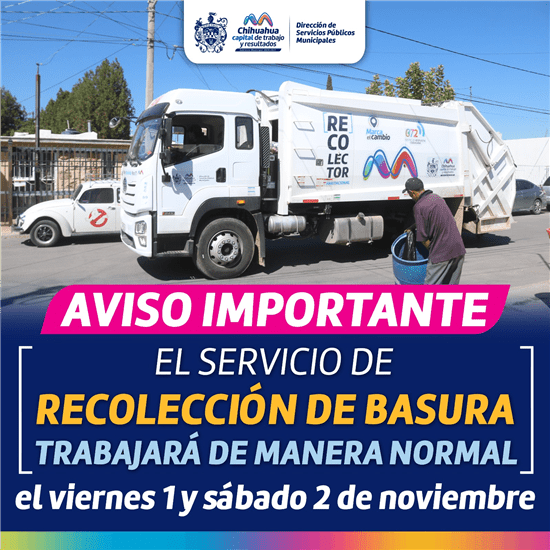 El Gobierno Municipal anunció que el servicio de recolección de basura funcionará sin cambios durante las festividades del Día de Muertos, el próximo 1 y 2 de noviembre. A pesar de que muchas instituciones y centros laborales descansarán en estas fechas, la Dirección de Servicios Públicos pide a la ciudadanía que saque su basura en los horarios habituales.