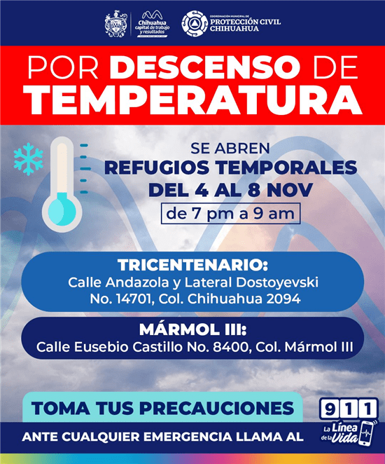 Debido a la caída en las temperaturas, el Gobierno Municipal abrirá desde esta noche dos refugios temporales para brindar un lugar seguro y cálido a quienes lo necesiten. Los refugios estarán en el centro comunitario Mármol III, al sur de la ciudad, y en el centro comunitario Tricentenario, al norte.