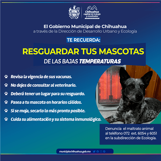 El Gobierno Municipal, a través de la Dirección de Desarrollo Urbano y Ecología, llamó a los ciudadanos a cuidar a sus mascotas durante la temporada invernal, ya que las bajas temperaturas pueden afectar gravemente su salud.