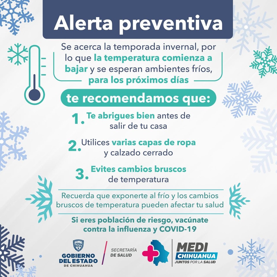 La Secretaría de Salud alertó a la población sobre la llegada de bajas temperaturas en gran parte del estado, especialmente en las zonas fronteriza y serrana, e instó a tomar precauciones para prevenir problemas como hipotermia, intoxicaciones por monóxido de carbono y quemaduras.