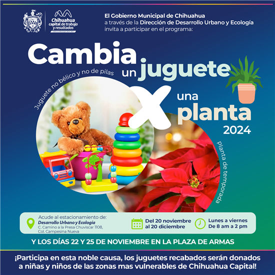 El Gobierno Municipal, a través de la Dirección de Desarrollo Urbano y Ecología, lanzó la campaña “Cambia un juguete por una planta 2024”, que busca recolectar juguetes nuevos para donarlos a niños en situación vulnerable durante la época navideña.