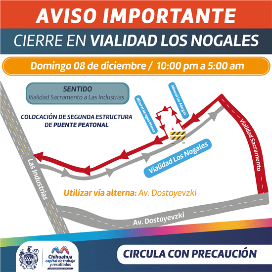 El Gobierno Municipal anunció que este domingo 8 de diciembre cerrará la vialidad Los Nogales, en el tramo entre la Vialidad Sacramento y la avenida de las Industrias, para instalar una nueva sección metálica en un puente peatonal.