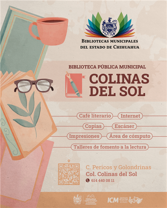 Ofrece el Instituto de Cultura del Municipio la oportunidad de disfrutar los servicios y actividades de la Biblioteca Pública Municipal Colinas del Sol, ubicada entre las calles Perico y Golondrinas, en la colonia del mismo nombre.