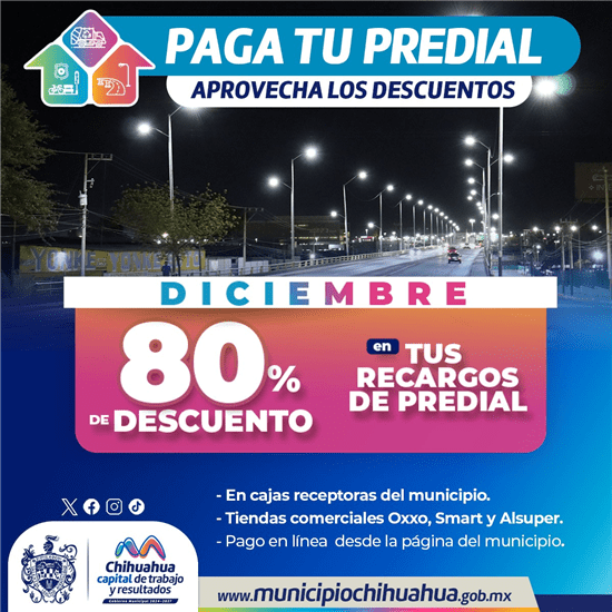 El Gobierno Municipal invita a los ciudadanos a aprovechar los últimos días del descuento del 80% en los recargos del Impuesto Predial. Esta promoción estará vigente hasta el 30 de diciembre y está disponible para personas físicas y morales.