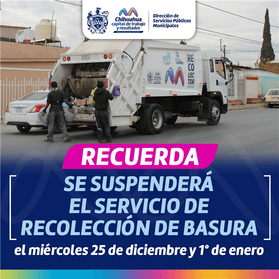 Informa a la población que se tomen las precauciones necesarias para esos días sin servicio, ya que el 26 de diciembre y el 2 de enero se reanudará con normalidad. Además, el relleno sanitario estará cerrado esos días, y el 24 y 31 de diciembre operará solo de 7:00 a.m. a 2:00 p.m.