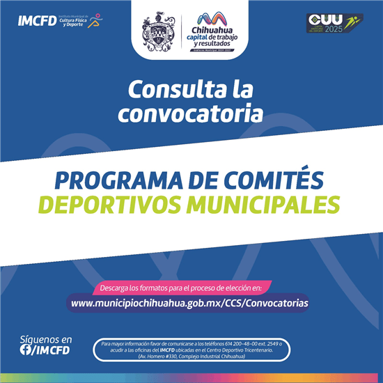 El Gobierno Municipal de Chihuahua, a través del Instituto Municipal de Cultura Física y Deporte, lanzó la convocatoria para renovar las mesas directivas de los Comités Deportivos Municipales, encargados de promover y organizar actividades físicas y deportivas en la ciudad.